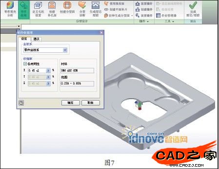 此命令是用來設置塑料材料的收縮率,當上一步驟中選擇好材料后,便有了一個范圍值,也可輸入具體的數值,如圖7 所示。