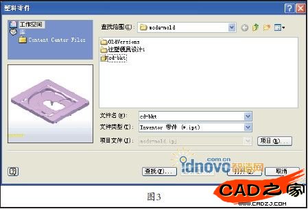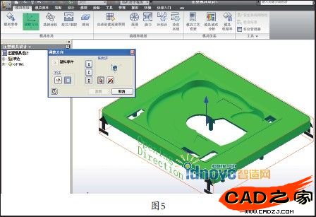 此步驟是用來調整塑件產品的出模方向,當塑件導入模具設計環境后,會有一個默認的方向,但是默認的方向有可能不是正確的模具出模方向,所以必須進行調整。如圖5所示,這里調整出模方向非常重要,因為Inventor Mold自動補孔(自動修補破孔)方式會根據出模的方向來定。