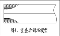 本例中,鋼坯通過(guò)軋輥后的變形是由厚變薄,并且鋼坯在厚度方向上的變形是上下對(duì)稱的,根據(jù)軋制速度及鋼坯咬入情況,我們將鋼坯分成多個(gè)變形體(如圖2所示),從圖中看到,經(jīng)過(guò)第9個(gè)變形體后,鋼坯的咬入過(guò)程就已完成,所以,我們通過(guò)前9個(gè)變形體的運(yùn)動(dòng)分析,就可以了解實(shí)現(xiàn)變形模擬的過(guò)程,因?yàn)殇撆鞯淖冃问巧舷聦?duì)稱的,所以在合成鋼坯中,每個(gè)變形體為兩塊(上下各一塊) ,前9個(gè)變形體重疊后如圖3所示。第10個(gè)及以后的變形體的重疊方法以此類推。