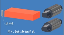 在整個(gè)變形過(guò)程中,我們以變形后的鋼坯模型為基體,各變形體在運(yùn)動(dòng)過(guò)程中分時(shí)段與基體重合,就可達(dá)到變形的效果。因此,各變形體的位置約束均以基體為基準(zhǔn),同時(shí),在軋制過(guò)程中,基體也在移動(dòng),故我們建立了一個(gè)固定的虛擬體(可設(shè)為不可見(jiàn)體)作為鋼坯運(yùn)動(dòng)的參照(如圖5所示),軋輥的轉(zhuǎn)動(dòng)速度及基變形體的移動(dòng)秩序均可以通過(guò)基體的移動(dòng)來(lái)確定。
