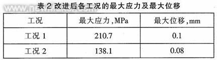 原結構采用的是ZG230-450,從計算結果來看,該模型最大應力處在其根部,約為250 MPa,整個根部區域應力基本都在200 MPa以上,已超過所選材料的屈服極限,在長期高應力作用下,極易產生疲勞斷裂,與實際損壞部位一致(說明原模型簡化合理準確),這是原結構破壞的主要原因。