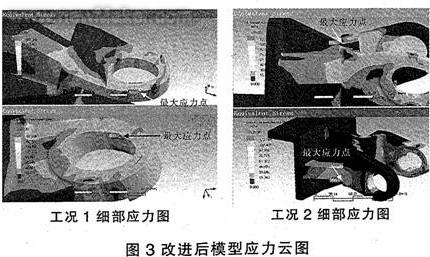 根據原設計結構的分析結果,我們加強了筋板和延伸了筋板的大小,見改進后模型。同時將材料改為ZG270-500MPa。并按上述方法進行了重新計算。