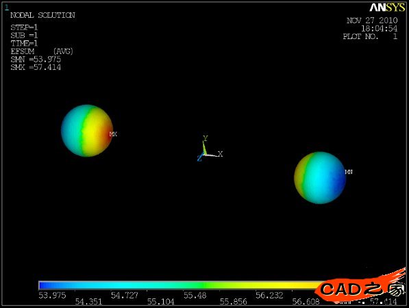 /prep7 et,1,solid123 mp,perx,1,1 mp,perx,2,1e5 sph4,1,0,0.2 sph4,-1,0,0.2 sph4,0,0,10 vsel,all vovlap,all numcmp,all vsel,s,,,1,2 vatt,2,,1 smrtsize,1 esize,0.02 vmesh,all vsel,s,,,3 vatt,1,,1 esize,0.5 vmesh,all vsel,s,,,1 aslv,s nsla,s,1 d,all,volt,10 vsel,s,,,2 aslv,s nsla,s,1 d,all,volt,-10 asel,s,,,5,6 nsla,s,1 d,all,volt,0 /sol antype,static,new vsel,s,,,3 allsel,below,volu solve save /post1 vsel,s,,,3 allsel,below,volu set,1 /graphics,full /show,win32c /contour,1,128 vsel,s,,,1,2 aslv,s nsla,s,1 plnsol,ef,sum