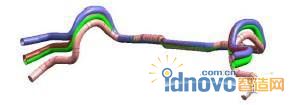 3) 第三類是有大變形的懸架零件與車身零件或相對車身不動的零件的間隙校核(如穩定桿和車身縱梁的間隙校核)。以穩定桿為例,先將穩定桿作為柔體建到動力學模型中,完成相關工況計算后,用MotionView Utilities工具中export deformed shape選項,將穩定桿柔體在某一時刻下變形后的形狀以Nastran格式的文件輸出,在經過處理,就可以在UG里生成穩定桿在此時刻變形后的幾何面。圖6所示就是用這種方法生成的穩定桿UG包絡,再放到整車UG模型中進行間隙校核。