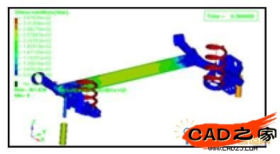 MotionView中的載荷輸出工具和疲勞分析工具使得計算的載荷和應力應變結果可以方便的輸出,并且支持相關有限元軟件和疲勞軟件的輸出格式。以某扭力梁后橋為例,載荷計算完成后,可以使用Load Export工具直接將扭力梁后橋界面點的載荷結果轉化成Nastran格式的載荷約束文件,直接調用到Nastran有限元模型中進行應力疲勞分析,不需要做任何處理。另外,扭力梁是用柔體建模,做完載荷分析后,MotionView對柔體的后處理功能可以直接查看后橋柔體在各個工況下的應力情況(如圖3示),還可以使用MotionView的Fatigue Prep工具直接將柔體應力應變結果輸入給疲勞分析軟件nCode做疲勞分析。