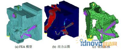 在PAS泵支架最大可用設計空間內建立有限元模型,見圖14(a),根據實際的工作情況,施加相應的約束和載荷,以應力為響應進行優化計算,得到應力分布云圖和優化后的拓撲,見圖14(b)及(c)。
