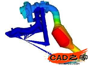 為圖2所示結構建立有限元模型——排氣歧管、渦輪增壓器(包含壓氣機)以及排氣尾管采用高階體單元劃分網格;支架采用殼單元劃分網格;螺栓及發動機主體結構采用剛性單元模擬。為有限元模型施加正確的位移約束,定義模態載荷步進行試算,提取系統的特征頻率,確定使用3mm厚度的支架時系統剛度高于設計目標。然后定義桿身部分為設計空間,建立合適的響應、約束及優化目標,提交OptiStruct求解器進行優化計算,計算收斂后通過后處理發現,桿身厚度從初始的3mm設計下降至2.505mm即可滿足設計要求,優化后的1階模態位移云圖如圖3所示。