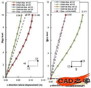最后,討論結構側向位移的變化。圖5展示了對稱結構優化前后X方向及Y方向角柱的側向位移。由于對稱結構無扭轉發生,所有柱在每個方向具有相同的側向位移。優化前,角柱的側向位移大于限制值1/450,但優化之后這些位移都小于或等于限制值H/450。圖6展示了非對稱結構優化前后X方向及Y方向角柱側向位移。觀察到柱C5優化前的X方向位移是大于柱C2,這表明結構在地震荷載的作用下發生了扭轉。由于在X方向每層缺少一根梁,因此X方向的側向剛度不對稱且相對較弱。這種結構的非對稱引起了扭轉,致使在X方向柱的側向位移不同。然而,我們發現在優化后柱C2的位移與柱C5接近,這表明結構在優化過程中桿件截面尺寸重新設計,以增強X方向的側向剛度,從而減輕了在地震荷載作用下結構產生的扭轉。