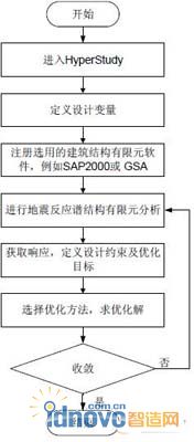 基于上述考慮,本文重點研究以樓層位移為設計約束、以結構總重量/質量/造價最小為目標的桿件截面尺寸優化方法。HyperStudy提供了強大的優化功能以及開放式的優化平臺,它允許調用任何可獨立執行的分析軟件或程序,以實現本專業特殊要求的優化問題。而SAP2000、GSA等是土木工程行業很普遍使用的建筑結構有限元分析軟件,它們提供了多種彈性及塑性地震分析方法如反應譜方法,且可輸出清晰易讀取的文本文件供軟件接口使用。應用HyperStudy進行優化設計的詳細過程,可參見下列流程圖(圖1)。
