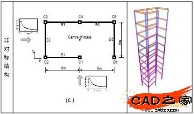 我們可借助兩座十層三維鋼筋混凝土框架結構的簡化模型,以研究本文提出的建筑結構抗震優化設計方法。如圖2(a-d)所示,一座是對稱結構,另一座是非對稱結構。圖中僅顯示主框架梁,而次梁則未考慮,因為本算例主要用來顯示主框架梁柱在優化中的變化。對稱結構與非對稱結構對比的目的在于研究三維結構在優化設計過程中扭轉效應的變化,以比較這兩種結構優化結果的差異。每座結構均分別施加X方向與Y方向的反應譜地震力。根據中國《建筑抗震設計規范》(GB50011-2001), 5%阻尼設計反應譜如圖3所示,考慮前九個振型,并采用CQC方式組合結構每個振型的響應。為方便設計及施工,結構分成叁個組:一~四層、五~七層、八~十層。假設梁的初始尺寸為0.2X0.45米, 其上下限為0.2~0.7米,柱為0.3X0.3米,其上下限為0.3~0.6米。在此,假設梁截面尺寸允許變化的范圍較大,目的在于測試梁高在優化過程中的變化,實際設計時梁高的上下限應根據結構設計規范、建筑設備對樓層凈空等要求來確定。在此算例中,樓層側向位移被作為設計約束,其限制假假設為H/450(其中,H為樓層距地面的高度),而設計規范(GB50011-2001)所要求的樓層層間位移角將會在稍后的研究中考慮。