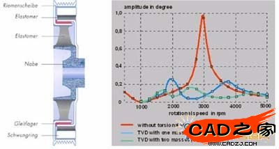 凸輪軸減震器是一個橡膠-金屬組件結構,在振動過程中承受扭轉應力。關于它的功能,可以對比曲軸中的扭轉震動阻尼器。從圖1. 可以看出,凸輪軸和曲軸的共振在阻尼器作用下減小了。