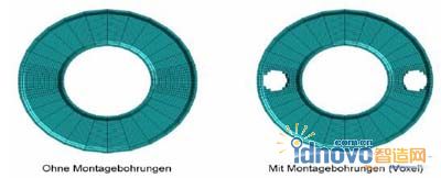 在這個例子里,已經通過壽命檢測試驗的均勻、連續橡膠材料的凸輪軸減震器將要被修改。由于裝配要求其在一個特定的位置開一最小直徑的裝配孔,并且在修改過程中不能改變其壽命和剛度。新的設計借助有限元分析和優化方法來避免應力的增加和壽命的減少,并且不用創建許多樣件。但在設計的開始階段并不能確定能否滿足所有要求,比如壽命和剛度要求,因此需要進行估算。