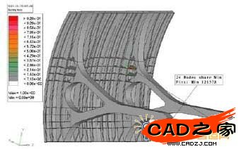 吊耳工作時可看作是將吊耳所在位置上的節點沿Y向指定一個很小的位移值。底部橫向肋上其他點的位移約束全部去掉。結構的最大位移值為66.5mm,位于面板上部中間;結構中除支鉸外的其他部分受力比較均勻,應力值均小于259MPa。