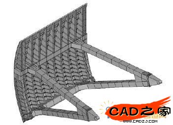 根據以上分步拓撲優化結果,可以得到模型的支臂、縱向肋和橫向肋等部分的布局方案。擋水面板的支持框架中含19根縱向肋(10號縱向肋處在鋼閘門的對稱面內)。利用各部件的設計方案建立弧形鋼閘門的三維模型(參見圖8 )。各部件初始尺寸可參見附錄1。