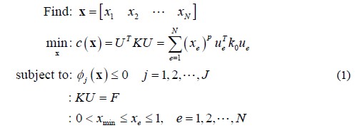 在SIMP方法中,若結構分析材料有限元方法進行,則單元的偽密度為單元的設計變量,偽密度取值范圍是(0 1]。偽密度趨于零表示單元中無材料,等于1則表示單元中材料無空隙。偽密度介于0和1之間的單元稱為中間密度單元。為了便于提取邊界,需減少中間密度單元的個數,因此往往采用密度懲罰的辦法,即單元中材料的彈性模量與偽密度的p次方成正比。p即為密度懲罰因子,本文取其值為3。同時,為了避免棋盤格等數值不穩定現象的出現,需對目標函數的敏度做濾波處理。