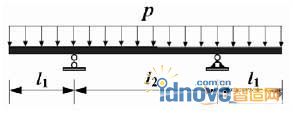 兩組支臂的位置可通過如圖3 所示的外伸等直梁中支撐的位置確定。易知,在均布荷載作用下,為保證梁在支撐處的轉角為零,利用材料力學中梁的變形分析可知支座距離中心的長度(