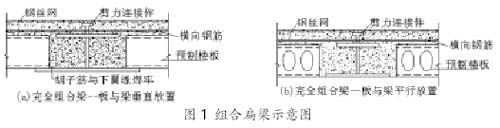 組合扁梁樓蓋由鋼梁和預(yù)制鋼筋混凝土空心樓板組成,其中預(yù)制鋼筋混凝土樓板搭在鋼梁的下翼緣上。加配橫向鋼筋和鋼絲網(wǎng)是為了保證在扁梁達(dá)到強(qiáng)度極限狀態(tài)之前不發(fā)生混凝土板縱向剪切破壞,剪力連接件是保證剪力有效地傳遞及疊合板共同工作。