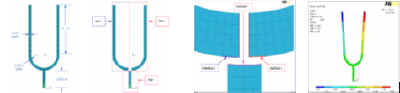 1. 例1 用總體有限元法、固定界面模態(tài)綜合法分別計算音叉的頻率,進行比較。音叉的幾何尺寸如圖2所示,把結(jié)構(gòu)劃分成三個超單元如圖3所示,劃分的固定界面如圖4所示。材料屬性:彈性模量:1.90×1011 N/m2,泊松比:0.3,密度:7700 kg/m3。