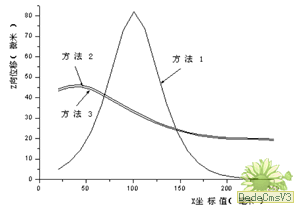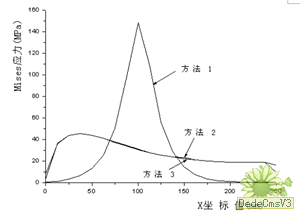 由表1可知,方法1得到的最大位移在壓心線上翼梢處,最大應力在壓心處,最大位移和應力都較后兩種方法大,且位置不同。方法2和方法3得到的結果非常接近,最大位移量偏差2.98%,而最大應力值偏差只有1.89%,并且最大位移和最大應力出現的位置也極為接近,最大位移出現在翼梢處,而最大應力出現在翼根處,跟實際實驗情況是一致的。利用ANSYS提供的路徑定義方法,定義兩條路徑:翼梢處(y=35mm處)和翼根處(y=0mm處)。將翼梢處的位移和翼根處的應力分別映射到該兩條路徑上。圖2為翼梢處Z向位移的比較結果。圖3為翼根處Mises應力比較結果。(為清楚地顯示方法2和方法3的差異,在翼根兩端應力差異保持不變的情況下,將其他數值差異放大了10倍)。