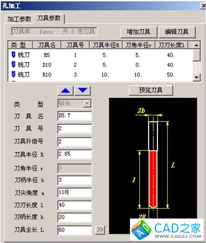 2) 雙擊 中的“ ”,進(jìn)入刀具參數(shù)頁重新選取ø5.7的鉆頭(如刀具庫里沒有ø5.7的鉆頭,可自己建立一把),并按圖-8設(shè)置刀具參數(shù):