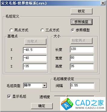 2)選取“參照模型”方式——〉點(diǎn)“參照模型”按鈕,系統(tǒng)自動(dòng)根據(jù)模型計(jì)算毛坯,結(jié)果如下圖-3所示: