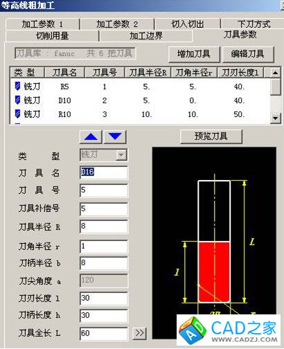 4. 選擇“刀具參數(shù)”選項(xiàng)標(biāo)簽,按圖-16所示選擇ø16(R1)的圓鼻刀和設(shè)置刀具參數(shù)(由于受機(jī)床的剛性、吃刀量、刀具材料、工件材質(zhì)、裝夾方式等多種因素影響,進(jìn)給和轉(zhuǎn)速的選擇要根據(jù)具體情況而定,這里不再贅述)。