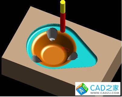 3、根據(jù)狀態(tài)欄提示拾取曲面,當(dāng)把鼠標(biāo)移到型腔內(nèi)部時(shí),曲面自動(dòng)被加亮顯示,拾取剛生成的旋轉(zhuǎn)曲面后,按鼠標(biāo)右鍵確認(rèn),提示拾取“干涉檢查”時(shí),左鍵拾取底下曲面作干涉面。根據(jù)提示完成相應(yīng)的工作,最后生成軌跡。如下圖-33: