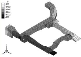 轎車副車架十分復雜,要求分析副車架總成時,連接前梁、后梁、左梁和右梁的21條焊縫焊接以后的變形規律。為此采用殘余塑變有限元方法進行分析。由于副車架由前梁、后梁、左梁和右梁四個薄壁梁結構組成,故采用四節點板殼單元。圖6為副車架總成焊接以后在X方向的變形圖。計算所得別克轎車副車架總成時,連接前梁、后梁、左梁和右梁的21條焊縫焊接以后的變形規律數據可供焊接工藝設計時的預留變形量以及夾具設計等參考。本例的成功是一個重大的突破,它為大型復雜結構的變形分析提供了廣闊的前景。
