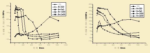 寶鋼300噸轉爐爐體直徑D=8500mm,壁厚t=80mm。總裝時由兩條大的環焊縫把上下三段連接起來。由于爐體太大,曾考慮采用局部焊后消除應力處理,并要求確定加熱帶的合適寬度。分析時采用了粘彈塑性軸對稱有限元計算模型。如圖16和圖17所示,計算表明只有在加熱寬度很大時(B=2400mm)內表面的周向軸向應力才較低。由于該轉爐爐體直徑與壁厚都很大,采用局部焊后熱處理時所需的加熱寬度很大。顯然,這在經濟性和可實現性方面都存在問題,因而是不適宜的。根據爐體的工作條件以及材料的特性,如果焊接接頭的性能滿足要求,可以考慮不進行焊后熱處理的消應力處理工藝。同時,建議采用錘擊焊縫,焊后打磨焊縫等有利于減小和緩和殘余應力的工藝措施以及焊后消氫處理以降低焊接裂紋的傾向。通過可行性分析,避免了錯誤選用局部焊后熱處理可能帶來的不良后果,同時大大節約了人力、物力與資金。