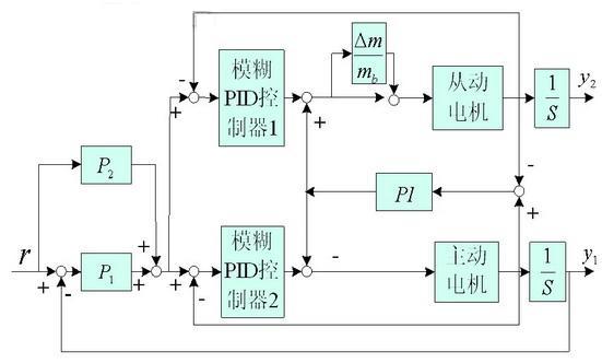 在龍門移動式鏜銑床的同步伺服系統中,兩個伺服子系統按同一速度給定信號運動,定義其中一個伺服系統為主動軸,另一個為從動軸,就構成了獨立的主—從驅動方式。通過對直線電機進行推力控制,使兩軸保持同步。本文采用主從控制結構,僅對主動電機使用位置控制。主動電機的位置控制器輸出當作從動電機的速度命令信號,當主動電機受到外界干擾產生位置反饋的變化,從動電機的參考速度與主動電機的參考速度一樣也隨之變化,這樣將提高控制系統耦合結構的安全系數。同步控制系統結構原理圖如圖2所示。其中,P2為位置前饋控制器;P1為位置比例控制器;模糊PID控制器為速度控制器,以實現對輸入信號的快速精確響應;PI控制器對動態變形力補償,防止高速運行下,過大的雙軸同步誤差對系統造成危害。#p#分頁標題#e#