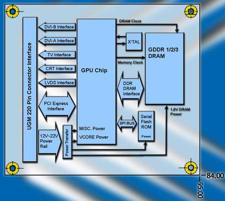 為了免除上述兩種可能的情況,控創科技(Kontron)與圖誠科技(XGI)首次合作推出“嵌入式影像模組” (Universal Graphics Module, UGM), UGM是一款大小為84 x 95 mm的嵌入式影像模組,不同於一般傳統顯示卡需以90度垂直安裝的方式,嵌入式影像模組是以平行方式插入底板上以節省空間,更重要的是UGM嵌入式影像模組至少能提供3到5年的長期供貨性,快速且容易的導入客制化的硬體設計,當然也包括必要及耗時的驅動程式。透過COM Express的220接腳,UGM可經由1、4、8或16通道(PEG)來接收PCI-Express信號、視訊信號並且進行處理,包括視訊截取功能以及高達1GB DRAM記憶體,隨後亦透過該連接器把經轉換信號遞送回到底板上。對播放來源來說,UGM 1.0 規格目前支援雙LVDS、雙DVI以及雙VGA的撥放方式。