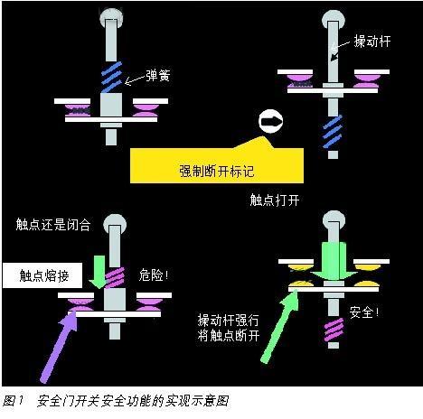 從結構上看,非安全開關通過彈簧施加的力來斷開觸點,而安全門開關通過剛性操動桿施加的力來斷開觸點。觸點熔接和彈簧失效的情況下,本來應該斷開的觸點卻無法斷開,此時就無法確保安全。而安全門的剛性操動桿,在此時可以強行斷開觸點,從而確保安全。因此,在實踐上往往在安全開關上印上經過認證的"→"箭頭標記如圖1所示。