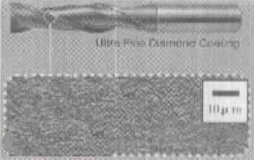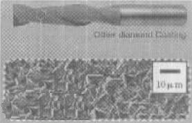 (b) 圖6 - 人造金剛石涂層是在基材表面形成晶核(微小的金剛石粒子)、晶核沿柱狀成長所構成的金剛石多結晶集合體。金剛石涂層薄膜表面凹凸不平(如圖1a所示),通常表面粗糙度為Ry4~10µm。鍍有金剛石薄膜的切削刀具在加工鋁合金時,其凹凸不平的表面形狀會影響到被加工表面的粗糙度,因此難以獲得精加工所期待的光潔表面。未涂層的超硬合金刀具雖然能獲得比較光潔的加工表面,但刀具刃部在很短的加工過程中就產生粘刀現象,從而影響工件表面粗糙度并導致刀刃的早期磨損,使之達不到預期的使用壽命。OSG 公司研制開發的超微細結晶金剛石薄膜不僅平坦光滑(見圖1b),并且與普通金剛石涂層銑刀的表面相比,超微細結晶金剛石薄膜涂層銑刀表面具有很好的光澤度。