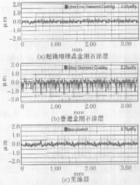 圖5- 在上述切削條件下進行了刀具壽命對比試驗,試驗結果見圖4。未涂層的超硬合金銑刀由于發生了粘著現象,經過很短時間的切削后就不能再使用;而超微細結晶金剛石涂層銑刀在切削長度達到700m 以后仍可繼續使用。由此可見,超微細結晶金剛石涂層刀具對于鋁合金的干式切削加工具有非常優良的切削性能。