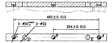 該定位機構的難點是調試時如何找正新增菱形定位銷的位置精度。調試前我們先將該定位機構裝配好,使傳動軸轉動靈活,新增菱形定位銷上下移動靈活,并提前制造一件調機靠尺(如圖2)。調試時,啟動定位油缸,使原圓柱定位銷及原菱形定位銷分別插入調機靠尺的A孔及C孔內,搬動撥叉使新增菱形定位銷伸出插入調機靠尺的B孔,通過調機靠尺上的D孔及E孔,用夾具底座1上原有的2-M12原墊板壓緊螺釘孔28壓緊墊板23,取下調機靠尺,用手電鉆在夾具底座上再配鉆、攻2-M12螺孔壓緊墊板,同時配鉆、鉸2-Φ12錐銷孔使墊板定位,然后調整新增菱形定位銷的伸出量和縮回位置,根據此伸出量和縮回位置,在夾具底座的端面用手電鉆配鉆、攻4-M8螺孔,將過渡墊板6固定,便完成整個定位機構的調試過程。由于調機靠尺上的三個定位孔相互位置精度可控制在±0.015mm以內,定位孔與定位銷的配合間隙在0.03mm以內,所以,用調機靠尺定位調整的新增菱形定位銷與原圓柱定位銷之間的位置精度可控制在±0.04mm以內,能滿足二、三缸柴油機缸體的定位要求。實踐證明,該定位機構安裝調試方便,定位可靠,能滿足我公司多品種、大批量的缸體生產要求,且節省了大量的工裝投資和調試時間。#p#分頁標題#e#
