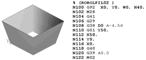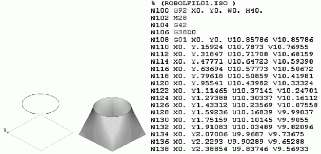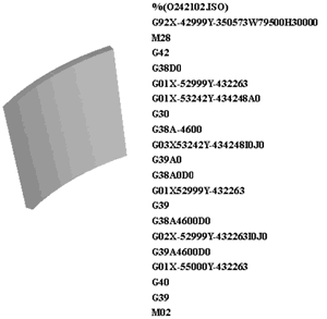在實際產(chǎn)品的加工中,經(jīng)常碰到產(chǎn)品的上下形狀各異或形狀大致相似而錐度不等的變錐度切割加工。針對這類產(chǎn)品常采用上下異形的編程方法,即將工件上下平面的輪廓按實際產(chǎn)品進行三維造型,然后利用CAM軟件的四軸聯(lián)動錐度切割的刀具軌跡進行編程,這種方式產(chǎn)生的程序量較大。圖3是某上圓下方的產(chǎn)品及其加工的程序。