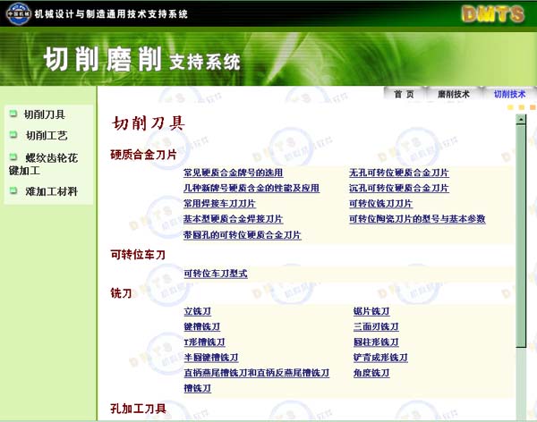 “切削加工技術(shù)”為技術(shù)人員提供了包括刀具數(shù)據(jù)、切削加工工藝、(螺紋、齒輪、花鍵)加工、難加工材料加工及切削試驗數(shù)據(jù)在內(nèi)的豐富的專業(yè)技術(shù)數(shù)據(jù)。