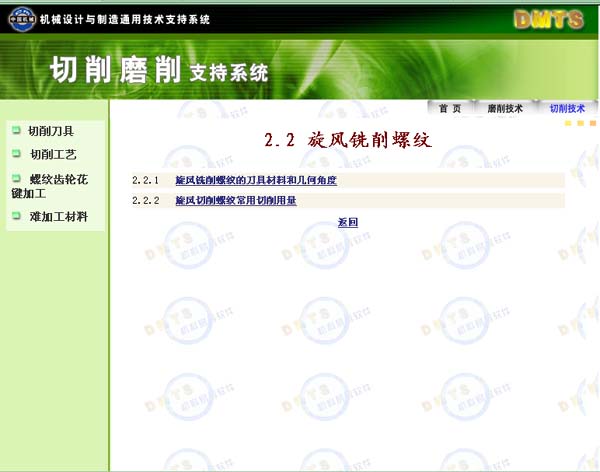 我們以“切削加工螺紋齒輪花鍵加工”查詢?yōu)槔齺碚f明該軟件的使用方法及所含內(nèi)容: