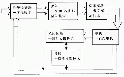 具有快速數(shù)據(jù)處理能力的CNC控制系統(tǒng)是高速機(jī)床的必要保證。圖1顯示了高速機(jī)床CNC控制系統(tǒng)的有關(guān)技術(shù)。前視技術(shù)、大容量內(nèi)存和ETH-ERNET通訊等技術(shù)是高數(shù)據(jù)處理速度的基礎(chǔ),NURBS曲線插補(bǔ)為復(fù)雜曲面提供了短程序段和光滑插補(bǔ)解決方案,數(shù)字驅(qū)動克服了模擬控制微量的時間滯后問題,高分辨率反饋技術(shù)是高精度加工的保障。