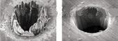 左邊的小孔是由皮秒紫外激光得到的,右邊是由飛秒紫外激光得到的。