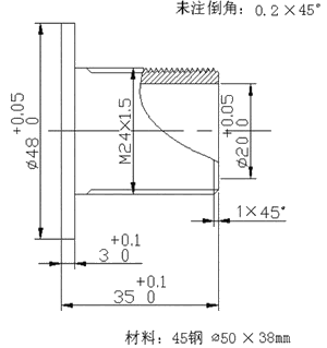 對內孔f21進行粗加工 G71 P1 Q2 U-0.5 W0 F100 N1 G0 X21.4 G1 Z0 F40 X21 Z-0.2 N2 Z-37 G0 X200 Z50 M5 回至起刀點,主軸停止 M0 程序停止 M3 S1 主軸啟動,轉速560r/min G0 X16 Z5 定位至(16, 5) G70 P1 Q2 G70精車循環N1~N2 G0 X200 Z50 定位至起點 G90 X50 Z-6 F100 G90外圓車削循環 X48 車至f48 G0 X100 Z100 M5 回到起刀點,主軸停止 M0 程序停止,零件調頭并裝夾 T0202 調用2#外圓精車刀 M3 S1 主軸啟動,轉速1120r/min G00 X50 Z2 定位至(50, 2) G71 U2 R0.5 G71外圓車削循環,