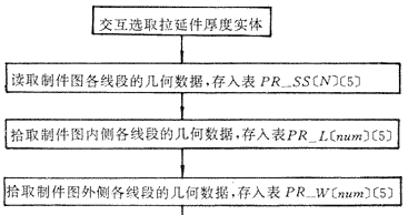 如上所述,AutoCAD環(huán)境下的制件圖內(nèi)外側(cè)線段實(shí)體信息的拾取(即圖2的前4個(gè)部分)是實(shí)現(xiàn)本程序的關(guān)鍵。現(xiàn)設(shè)定用于表達(dá)旋轉(zhuǎn)拉延件內(nèi)外結(jié)構(gòu)的所有線段均繪于“0”層(這也符合一般AutoCAD繪圖習(xí)慣),而尺寸標(biāo)注、剖面線等則置于另外的層,則內(nèi)外層線段幾何信息讀取算法如下: