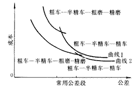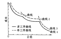 設(shè)計公差在制造系統(tǒng)中的實現(xiàn)總是通過一定的工藝序列完成的,如加工?80h7軸的工藝序列為粗車—半精車—精車。一定的工藝序列有其一定的加工能力范圍,當(dāng)公差變化到一定程序時會引起工藝序列的變化,如粗車—半精車—粗磨—精磨。實驗證明,同一工藝序列的公差—成本曲線與工藝序列變化時的曲線有不同的特征。