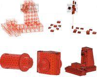 對基礎(chǔ)結(jié)構(gòu)件的小圓角、小倒角全部以直角處理;小角度斜面以平面處理,對分析無影響或影響較小的搭子面、螺孔及孔內(nèi)部筋孔等去除,安裝地腳螺釘?shù)陌疾廴コ?,安裝導(dǎo)軌壓板的斜槽去除,安裝光柵的支撐臺去除,主軸以實心處理;主軸與轉(zhuǎn)子及軸承內(nèi)圈做一體處理;定子與軸承外圈及外部支撐冷卻件做一體處理;工作臺以內(nèi)部布筋的箱體來簡化,使計算模型與實際零件保持最大限度的同一性。有限元網(wǎng)格的劃分采用了局部手工劃分與自由劃分相結(jié)合的方法,選取SOLID45 8節(jié)點六面體單元作為局部劃分網(wǎng)格用單元,SOLID95 20節(jié)點六面體單元為程序自動劃分網(wǎng)格用單元,選取 COMBIN14阻尼彈簧拉壓單元。絲杠、導(dǎo)軌及軸承移動結(jié)合部采用了等效彈簧連接,固定結(jié)合部采用了粘接方式。共劃分單元數(shù)115226個,節(jié)點總數(shù)208914個。計算用圖依次為:實體裝配圖、結(jié)合部網(wǎng)格、主軸網(wǎng)格、主軸箱網(wǎng)格、整機有限元模型(圖8)。#p#分頁標(biāo)題#e#