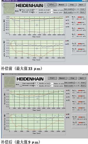 根據(jù)所測得的曲線,在系統(tǒng)里可對主軸進行補償。主軸熱補償功能,可以消除因熱伸長引起的誤差,從而提高機床精度。圖10為補償前和補償后的比較圖,補償前主軸熱伸長為0.033mm,補償后為0.009mm,具有明顯的效果。