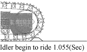通常,液壓發掘機械的履帶系統并不象汽車一樣有彈簧、阻尼一類的懸掛系統。變形主要集中在車架和履帶系統中承重輪架上,因此準確的動力學仿真分析是有必要考慮它們的彈性變形的。RecurDyn動力學軟件可以方便地與MSC/NASTRAN、ANSYS、I-DEAS等有限元分析軟件接口,將有限元模型傳遞到RecurDyn軟件中來,從而建立起含柔性零部件的剛柔耦合機械系統。本例中柔性體從MSC/NASTRAN中生成(見圖1)。履帶系統如履帶片、承重輪、主動輪等為剛體(見圖2),均由軟件模板生成,建模非常快速有效。其他部分如配重、發動機體、駕駛艙等用等效的質量、慣量替代,與車架的鏈接采用相應的彈簧阻尼器以模擬橡膠特性。