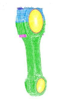 連桿是汽車發動機中傳遞動力的重要零件,它把活塞的直線運動轉變為曲軸的旋轉運動并將作用在活塞上的力傳給曲軸以輸出功率。連桿在工作過程中要承受裝配載荷(包括軸瓦過盈及螺栓預緊力)和交變工作載荷(包括氣體爆發壓力及慣性力)的作用,工作條件比較苛刻。現代汽車向著環保節能方向的發展,要求發動機連桿在滿足強度和剛度的基礎上,應具有尺寸小、重量輕的特點。本文應用ABAQUS有限元軟件,對新設計的某機型連桿進行了強度和剛度的校核。