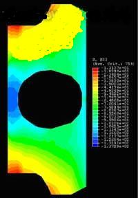 圖4為第一種方案連桿桿身與連桿蓋結合面處在裝配載荷+拉伸載荷下的法向應力分布,圖為5第一種方案連桿桿身與連桿蓋結合面處在裝配載荷+壓縮載荷下的法向應力分布,圖中的紅色區域表示失去接觸。