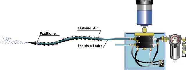 微量潤滑系統:簡單的說就是精密 控制油量的噴油裝置,通常分為外噴油和內噴油裝置。外噴油裝置是潤滑油和壓縮空氣分別獨立調節,壓縮空氣在噴嘴出口處將潤滑油通過高速氣流吹向切削刀刃,實現潤滑作用。