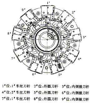 - 如圖1所示,471型車絲機的刀盤上裝有6把正楔刀桿(3把外圓刀桿、3把車絲刀桿)和3把反楔刀桿(外倒棱刀桿、內倒棱刀桿、端面刀桿各1把)。9把刀桿沿圓周間隔40°均布,其中3把外圓刀桿相互間隔120°,3把車絲刀桿相互間隔120°,相鄰車絲刀桿與外圓刀桿相互間隔40°(且車絲刀桿在前)。3把外圓刀桿上的外圓車刀與3把車絲刀桿上的外圓車刀并不在同一平面上,如圖2所示。圖2中車絲刀桿(a)和外圓刀桿(b)的規格及相應尺寸X1、X2見表1。